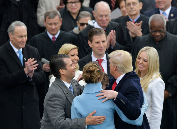 A group hug for the First Family after President Trump was inaugurated as the 45th President. (AP Photo/Susan Walsh) President Trump was joined by First Lady Melania Trump, their child 10-year-old Barron, and the rest of the First Family, including Ivanka, Donald, Jr., Eric and Tiffany Trump, Mr. Trump’s son and daughters-in-law, and grandchildren.