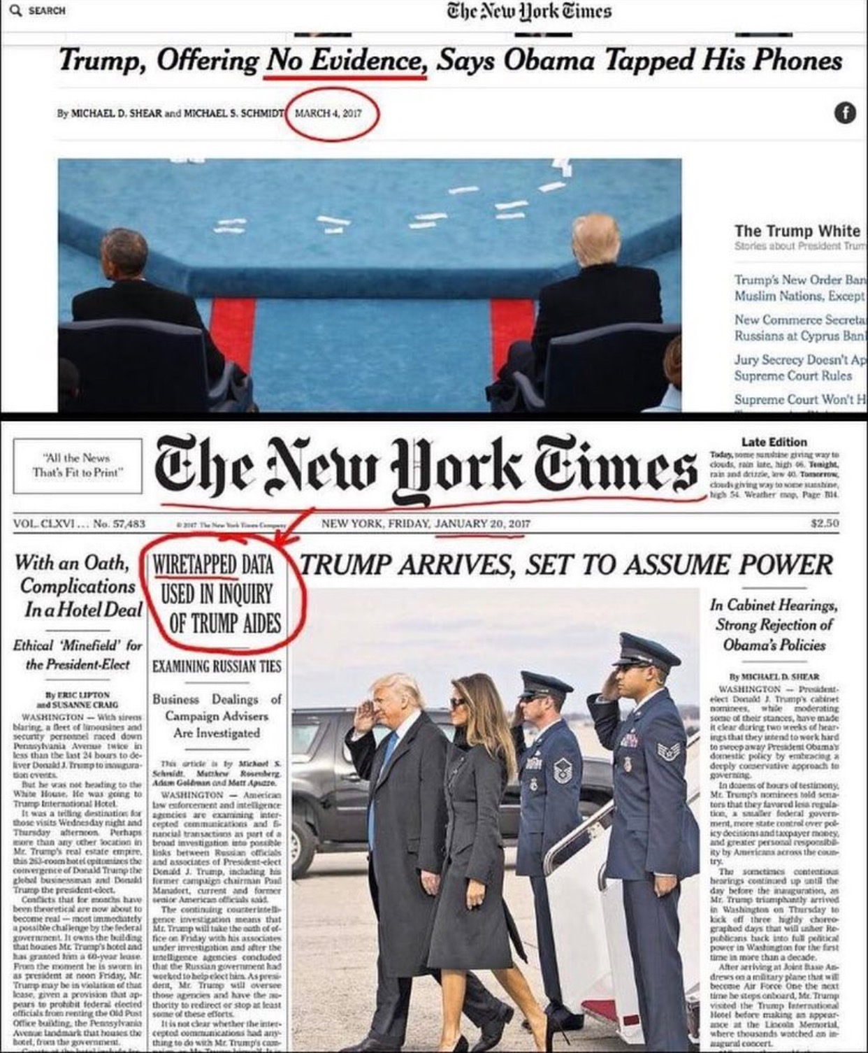 The New York Times reported on January 20 that Trump aides were wiretapped. In March, they write Trump has citied “no evidence.”