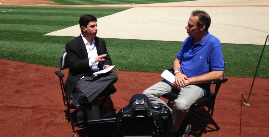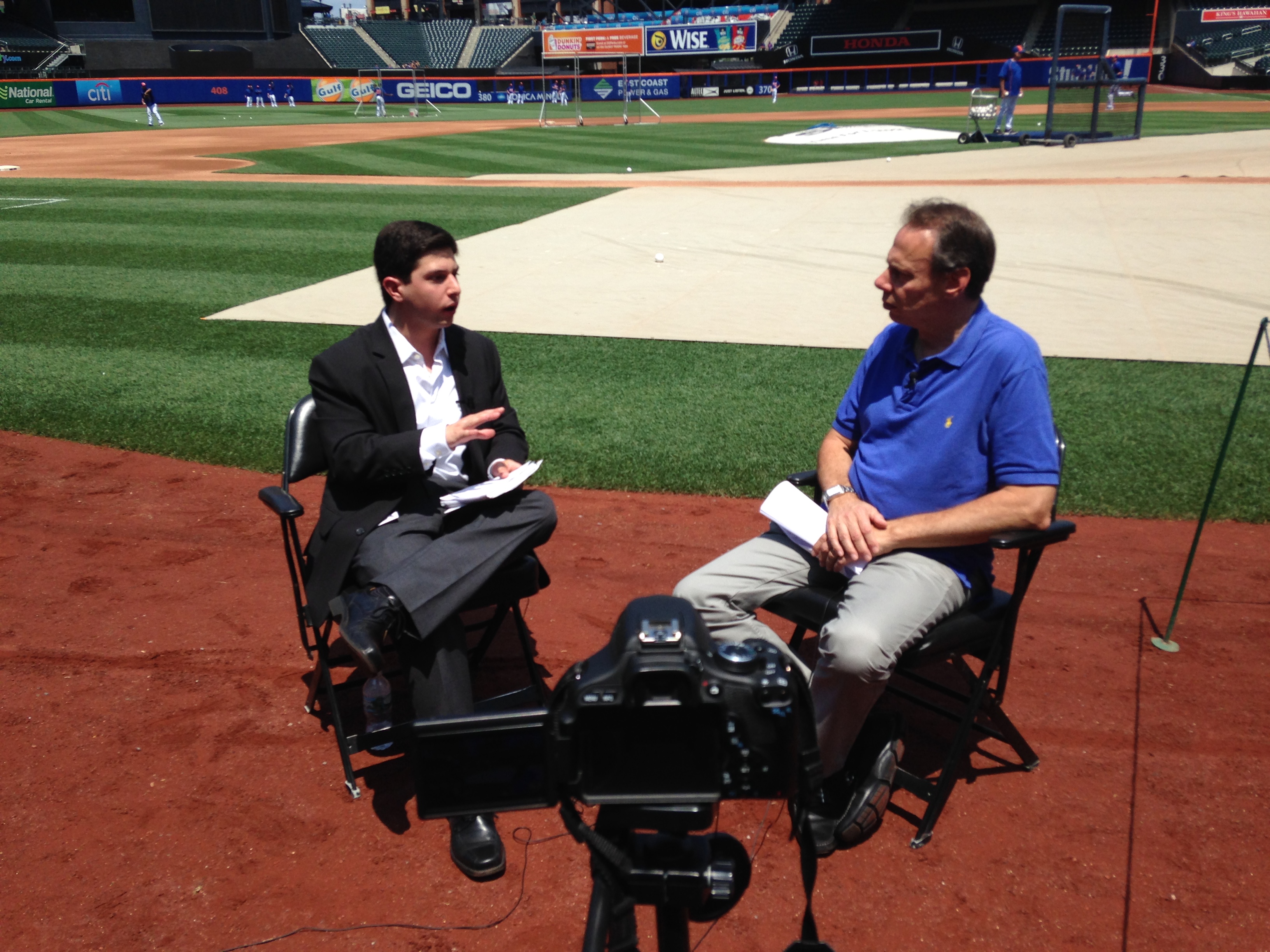 Author Neil A. Carousso (left) interviews Howie Rose, the radio voice of the Mets for an upcoming video feature. (Photo Credit: Christian Ladigoski, Carousso Enterprises.) “Right now I’m not sure if they should do it,” remarked Howie Rose about trading one of the plentiful young Mets pitchers for a hitter. Rose is in his 20th season in the Mets broadcast booth. “They could be developing something really really special here.”