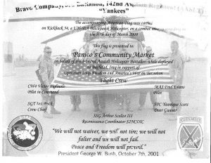 Heros 4 Our Heroes, via Facebook “He presented it to me and I presented it to a friend of mine in the store whose son was getting ready to deploy to Afghanistan. He hung it over his camp,” said Panico, continuing, “He had the flag commissioned by President (George W.) Bush and he returned it to me 4 years later.”