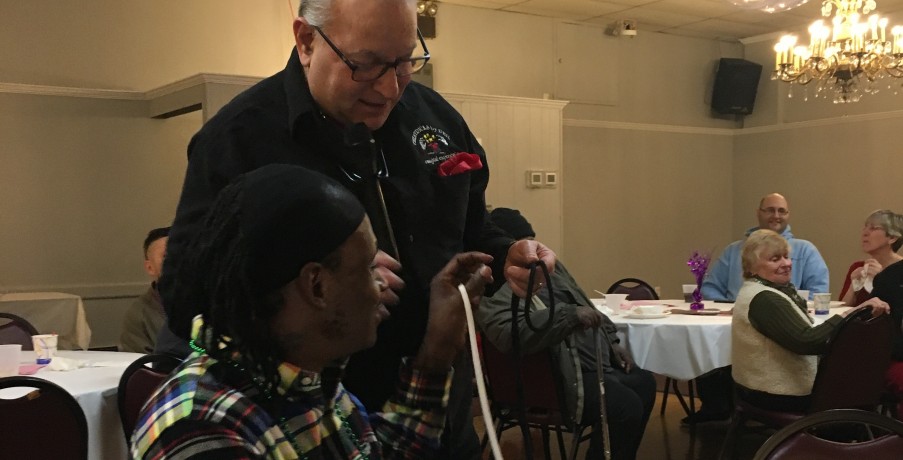 Featured Image: Levy (standing) shows a U.S. Army veteran one of his magic tricks at a veterans event at the VFW in Farmingdale on March 3. (Courtesy: Christian Ladigoski, Carousso Enterprises.)