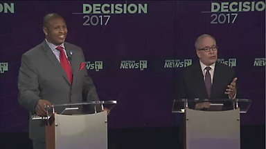 Featured Image: Comptroller Scott M. Stringer and Rev. Michel Faulkner debate on Spectrum News NY1 in October.
