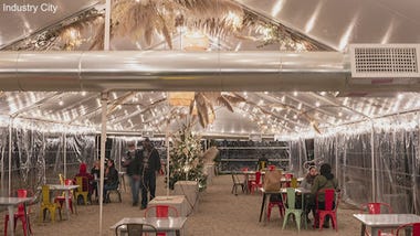 The complex owns its own streets and has sprawling outdoor dining space with large tents for inclement weather.
