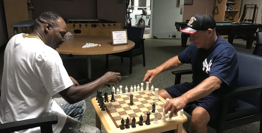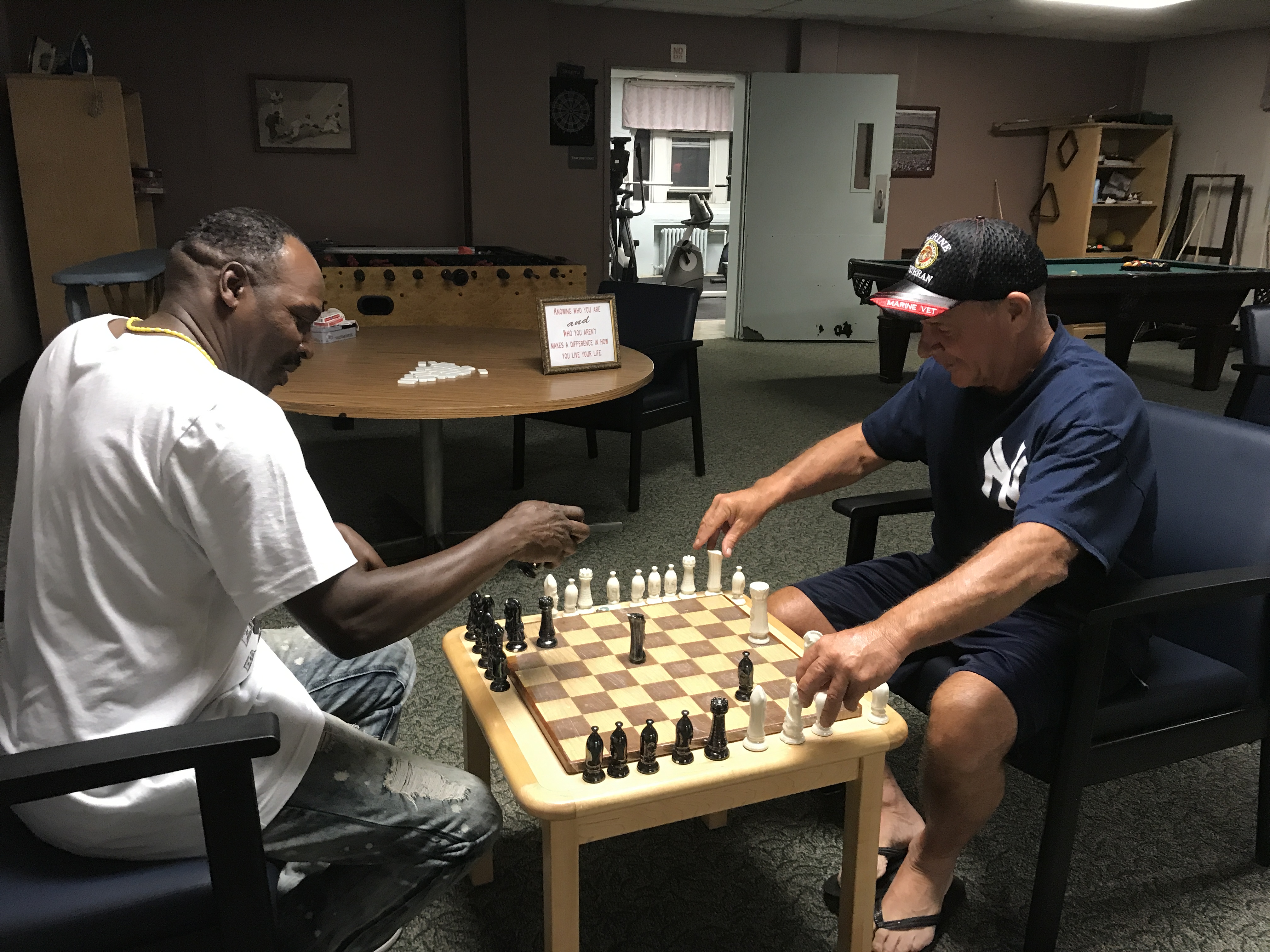 Army Veteran Donail Sykes (left) and Marine Corps Vet Andrew Brand play a game of chess at the Northport VA Medical Center. (Neil A. Carousso/Entercom)
