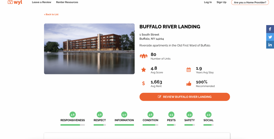 Tenants share their experiences in an apartment building, which informs others looking to rent. Reviews are vetted so it is appropriately mixed between positive and negative, and topics range from the landlord-tenant relationship to living conditions.